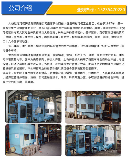 太谷繼紅瑪鋼鑄造有限公司是一家專業(yè)生產(chǎn)瑪鋼管件的企業(yè),至今已有20年的生產(chǎn)瑪鋼管件的歷史與累積。本公司在出口外貿(mào)瑪鋼管件方面尤其專業(yè)并具有相當(dāng)大的優(yōu)勢,長年生產(chǎn)的德標(biāo)管件、美標(biāo)管件、英標(biāo)管件遠(yuǎn)銷俄羅斯,伊朗,墨西哥,孟加拉,埃及,哈薩克斯坦,烏克蘭,智利等.包括歐洲、美洲、非洲、中東亞的二十幾個(gè)國家和地區(qū)。
